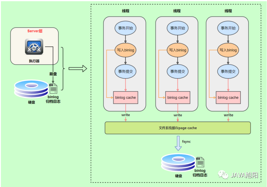 binlog的写入时机也非常简单,事务执行过程中,先把日志写到 binlog cache ,事务提交的时候,再把binlog cache写到binlog文件中。因为一个事务的binlog不能被拆开,无论这个事务多大,也要确保一次性写入,所以系统会给每个线程分配一个块内存作为binlog cache。
