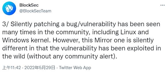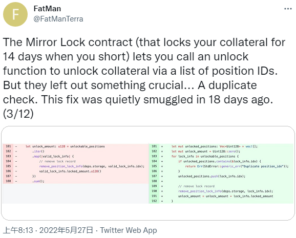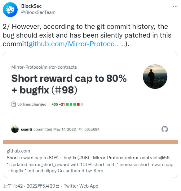 本月早些时候,大约在 UST 稳定币开始崩溃的同时,Mirror 开发人员悄悄修复了该漏洞 —— 补丁发布一周后,社区成员开始怀疑是否存在漏洞。