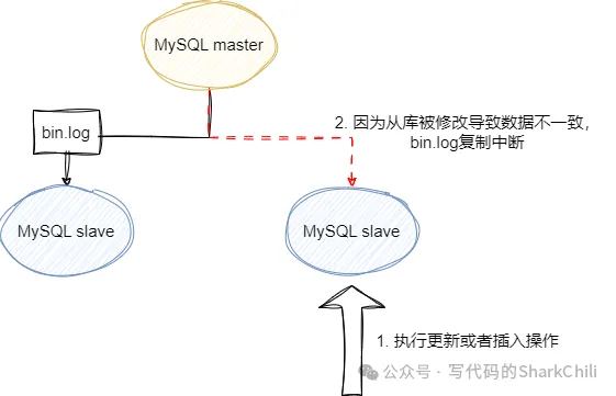 主从同步期间,要保证写操作都是在主库上,一旦写入操作不小心写入到从库,就会因为主从数据不一致导致bin.log同步复制数据中断。