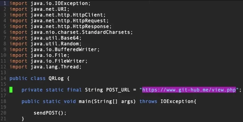 对这些组件的分析表明,一些攻击是通过木马化QR码生成器QRLog开始感染的。该恶意软件隐藏在一个用Java编写的正版QR码生成器中,并将恶意文件QRCodeWriter.java插入到合法项目中。该文件首先确定主机操作系统,然后下载一个适当的有效负载来启动逆向shell,以允许攻击者访问受害者的设备。
