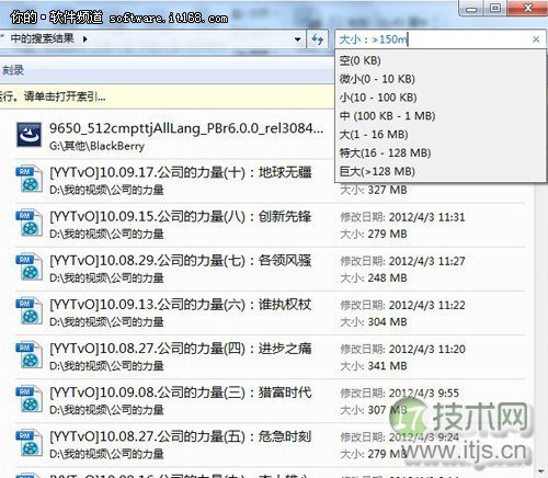假如用户觉得Windows 7已经给出的条件不符合自己的需要,还可以在冒号后面自己手动输入条件。假如我们输入这样的标准“大小:>150M”,Windows 7会马上按照新的条件搜索大于1500MB的文件。