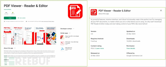 这时候的恶意应用程序属于办公/生产力类型,通过冒充 PDF 查看器、编辑器应用程序以及办公套件。值得一提的是,每当 ThreatFabric 向谷歌报告恶意应用程序并将其从商店删除时,源码库网络攻击者就会以一个新伪装上传新的滴管应用程序,迅速回归。