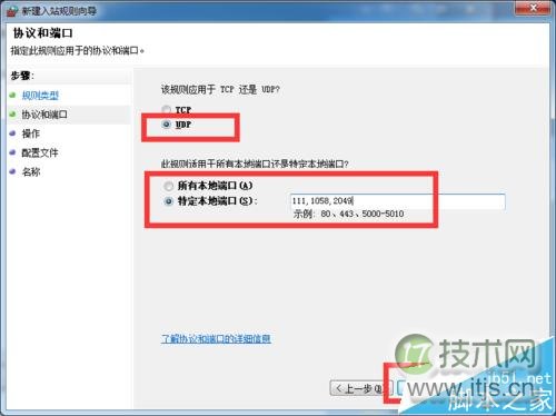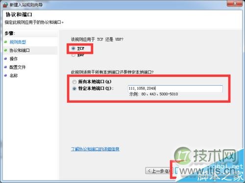 5、接下来先选择“TCP”,“UDP”项等设置完后再来设置。下面一栏选择“特定本地端口”,输入111、1058、2049后选择“下一步”。