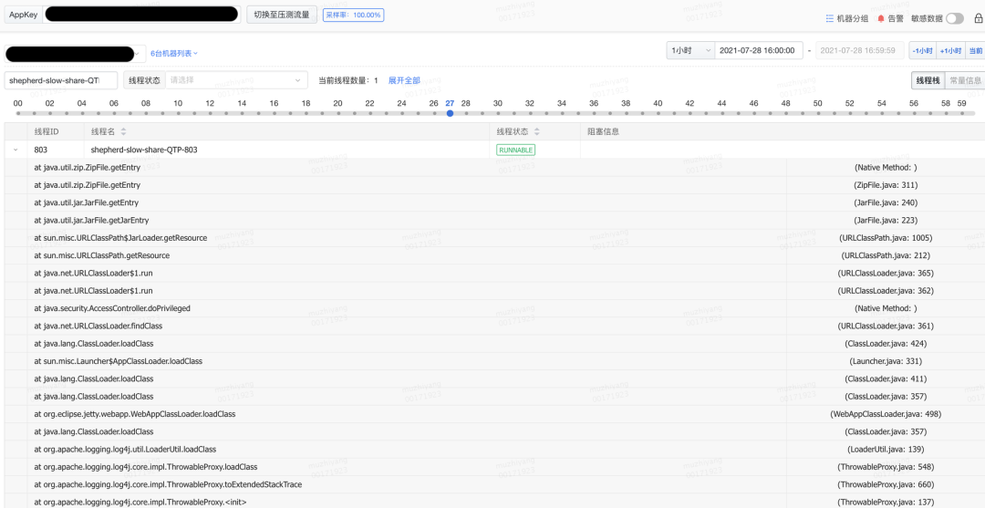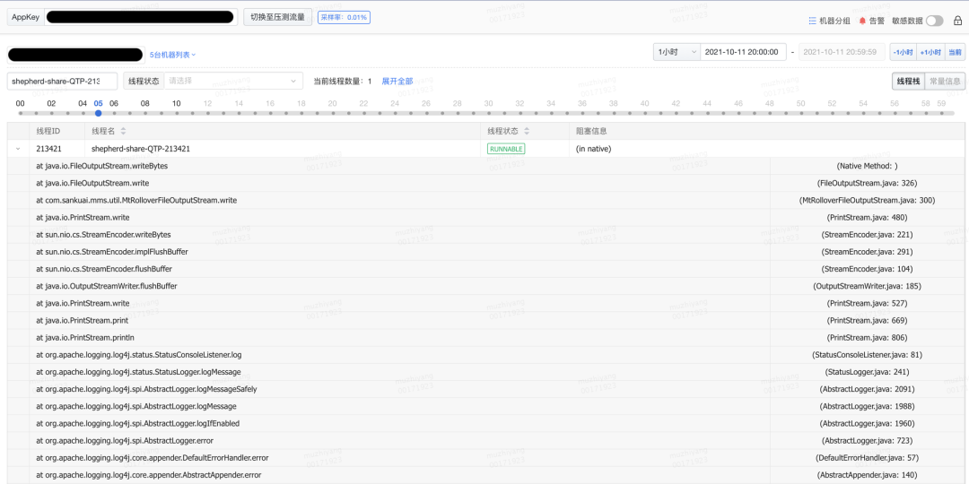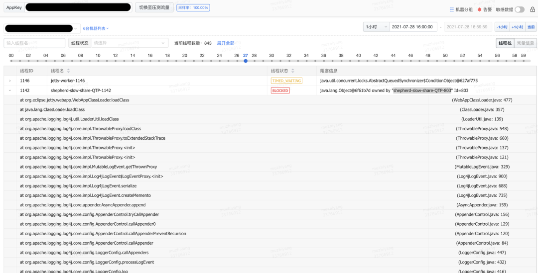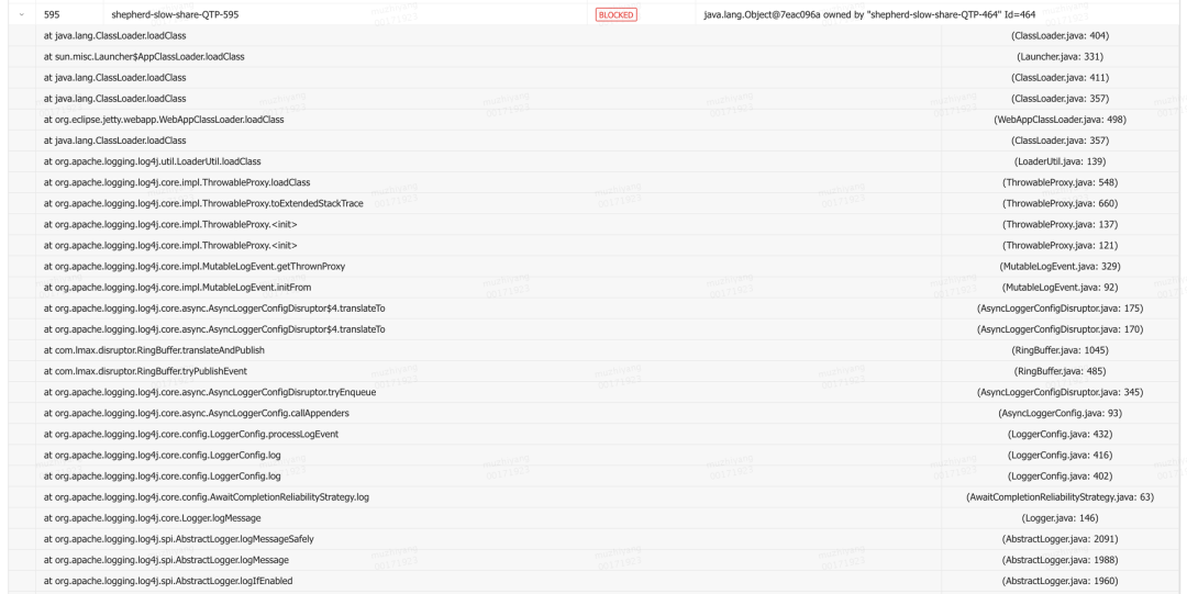 Java HotSpot(TM) 64-Bit Server VM (build 25.45-b02, mixed mode) 日志依赖版本 <dependency> <groupId>org.apache.logging.log4j</groupId> <artifactId>log4j-api</artifactId> <version>2.7</version></dependency><dependency> <groupId>org.apache.logging.log4j</groupId> <artifactId>log4j-core</artifactId> <version>2.7</version></dependency><dependency> <groupId>org.apache.logging.log4j</groupId> <artifactId>log4j-slf4j-impl</artifactId> <version>2.7</version></dependency> 日志配置文件 <?xml version="1.0" encoding="UTF-8"?><configuration status="warn"> <appenders> <Console name="Console" target="SYSTEM_OUT" follow="true"> <PatternLayout pattern="%d{yyyy/MM/dd HH:mm:ss.SSS} %t [%p] %c{1} (%F:%L) %msg%n" /> </Console> <XMDFile name="ShepherdLog" fileName="shepherd.log"/> <!--XMDFile异步磁盘日志配置示例--> <!--默认按天&按512M文件大小切分日志,默认最多保留30个日志文件。--> <!--注意:fileName前会自动增加文件路径,只配置文件名即可--> <XMDFile name="LocalServiceLog" fileName="request.log"/> <Scribe name="LogCenterSync"> <!-- 在指定日志名方面,scribeCategory 和 appkey 两者至少存在一种,且 scribeCategory 高于 appkey。--> <!-- <Property name="scribeCategory">data_update_test_lc</Property> --> <LcLayout/> </Scribe> <Async name="LogCenterAsync" blocking="false"> <AppenderRef ref="LogCenterSync"/> </Async> </appenders> <loggers> <AsyncLogger name="com.sankuai.shepherd" level="info" additivity="false"> <AppenderRef ref="ShepherdLog" level="warn"/> <AppenderRef ref="LogCenterAsync" level="info"/> </AsyncLogger> <root level="info"> <!--Console日志是同步、阻塞的,推荐只在本地调试时使用,线上将该配置去掉--> <!--appender-ref ref="Console" /--> <appender-ref ref="LocalServiceLog"/> <appender-ref ref="LogCenterAsync"/> </root> </loggers></configuration>本章节主要记录项目过去一段时间,我们所遇到的一系列日志导致的线程Block问题,并逐个深入分析问题根因。