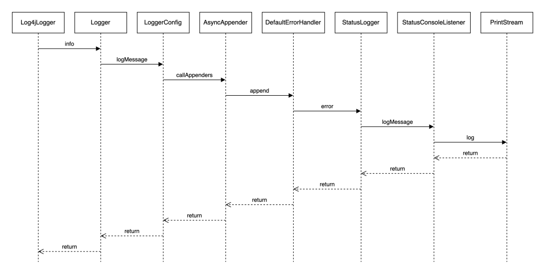 从Blocked线程堆栈不难看出这跟日志打印相关,而且是INFO级别的日志,遂即登陆机器查看日志是否有异样,发现当时日志量非常大,差不多每两分钟就写满一个500MB的日志文件。那大量输出日志和线程Block之间会有怎样的关联呢?接下来本章节将结合如下图4所示的调用链路深入分析线程Block的根因。