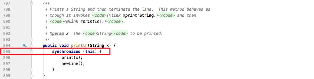 3.1.2 为什么会Block线程?从Blocked线程堆栈着手分析,查看PrintStream相关代码片段如下图5所示,可以看到被阻塞地方有synchronized同步调用,再结合上文发现每两分钟写满一个500MB日志文件的现象,初步怀疑是日志量过大导致了线程阻塞。