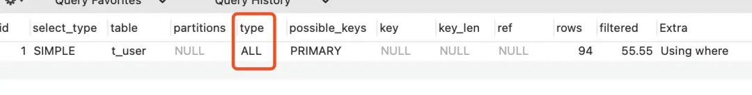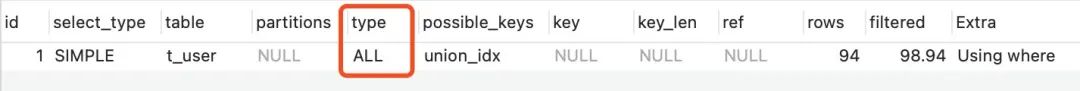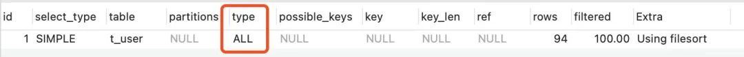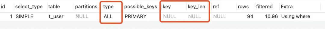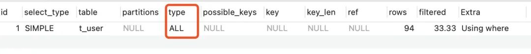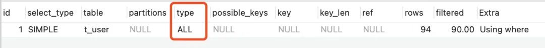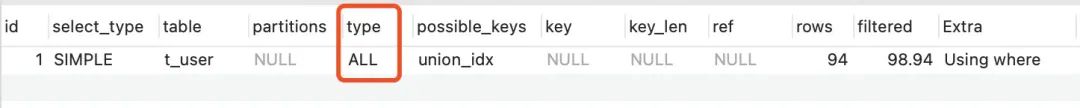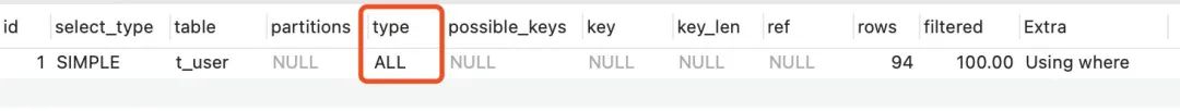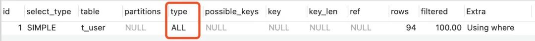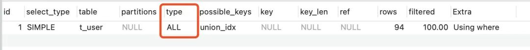 复制explain select * from t_user where id + 1 = 2 ;1.explain结果: