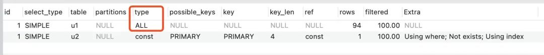 复制explain select * from t_user u1 where not exists (select 1 from t_user u2 where u2.id = 2 and u2.id = u1.id);1.explain结果: