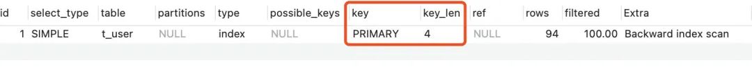 可以看到上述SQL语句使用了主键索引(PRIMARY),key_len为4;