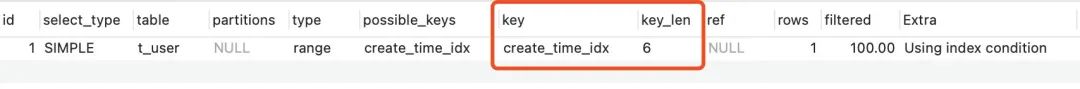复制explain select * from t_user where create_time > 2023-02-24 09:04:23;1.其中,时间是未来的时间,确保能够查到数据。