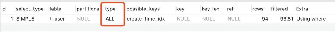 复制explain select * from t_user where create_time > 2022-02-27 09:04:23;1.explain结果: