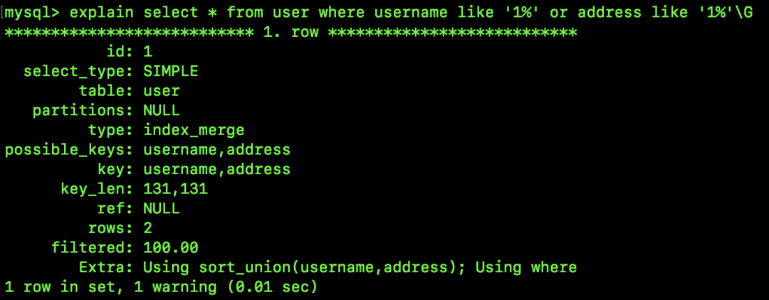 type 为 index_merge。Extra 为 Using union(username,address); Using where。这个 type 中的 index_merge 就是索引合并。