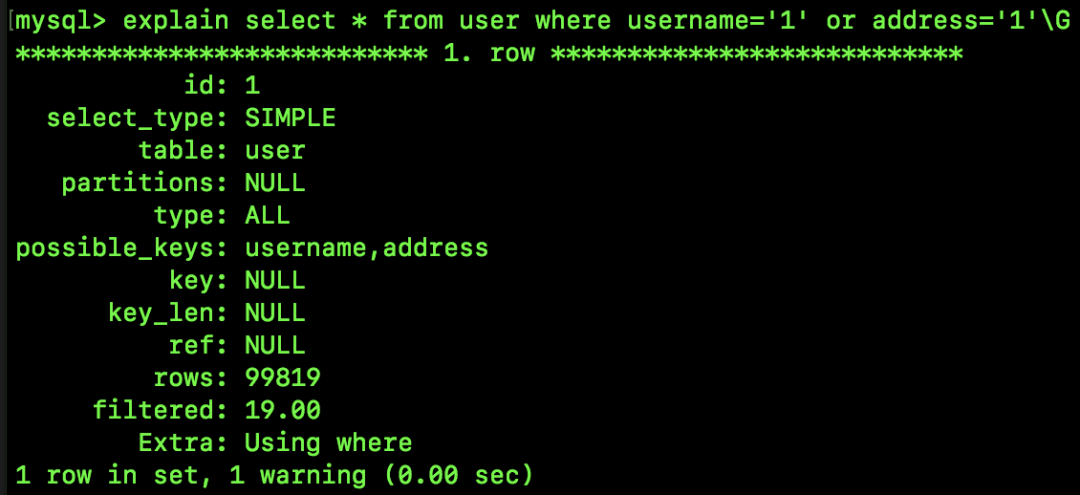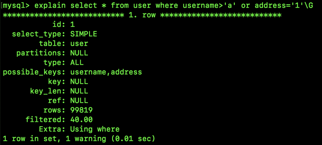复制select * from user where username like 1% or address like 1%;1.这个 SQL 在执行的过程中就会涉及到两个索引,需要去两棵索引树中进行搜索,再对搜索结果求并集,我们来看一下该 SQL 的执行计划: