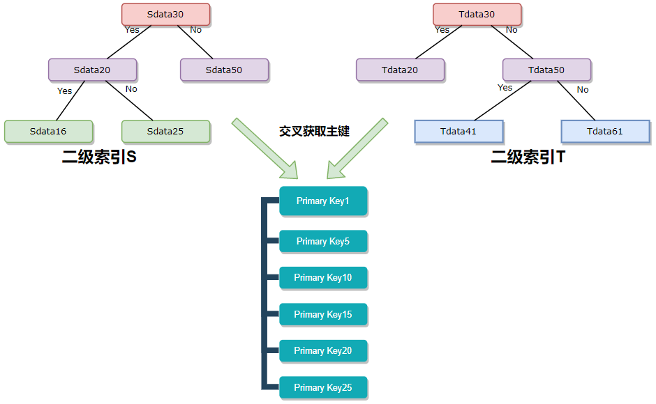 假设有二级索引 S 和二级索引 T,现在交叉获取主键(这里有一点需要注意,如果我们是单独在 S 和 T 上搜索,且 S 上搜索条件是 username like 1%,T 上的搜索条件是 address like 1%,那么在搜索的过程中,各自拿到的主键 id 是有序的,这也是 intersect 的前提):