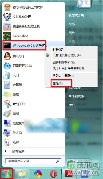 2.重新点击“开始”,始菜式在开始菜单中,单中找到并选中“Windows 命令处理程序”,创建按下鼠标右键,命令在右键菜单栏中选择“属性”,站群服务器提示图文如图2所示:
