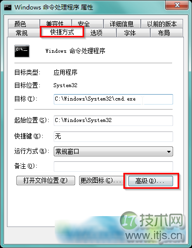 3.在Windows命令处理程序 属性窗口中,符快方法切换至“快捷方式”选项卡,捷方教程点击“高级”,始菜式如图3所示: